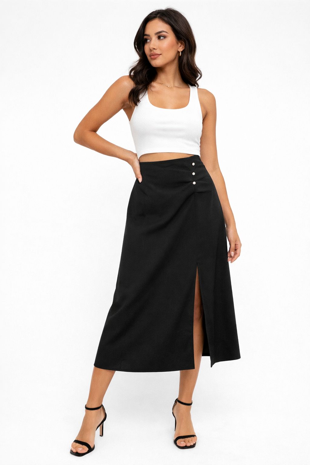 Make a bold yet sophisticated statement with our Midnight Muse High-Waist Slit Midi Skirt. Designed in a timeless black shade, this skirt features a flattering high-waist fit with stylish side button detailing and a subtle front slit for a modern, feminine touch.