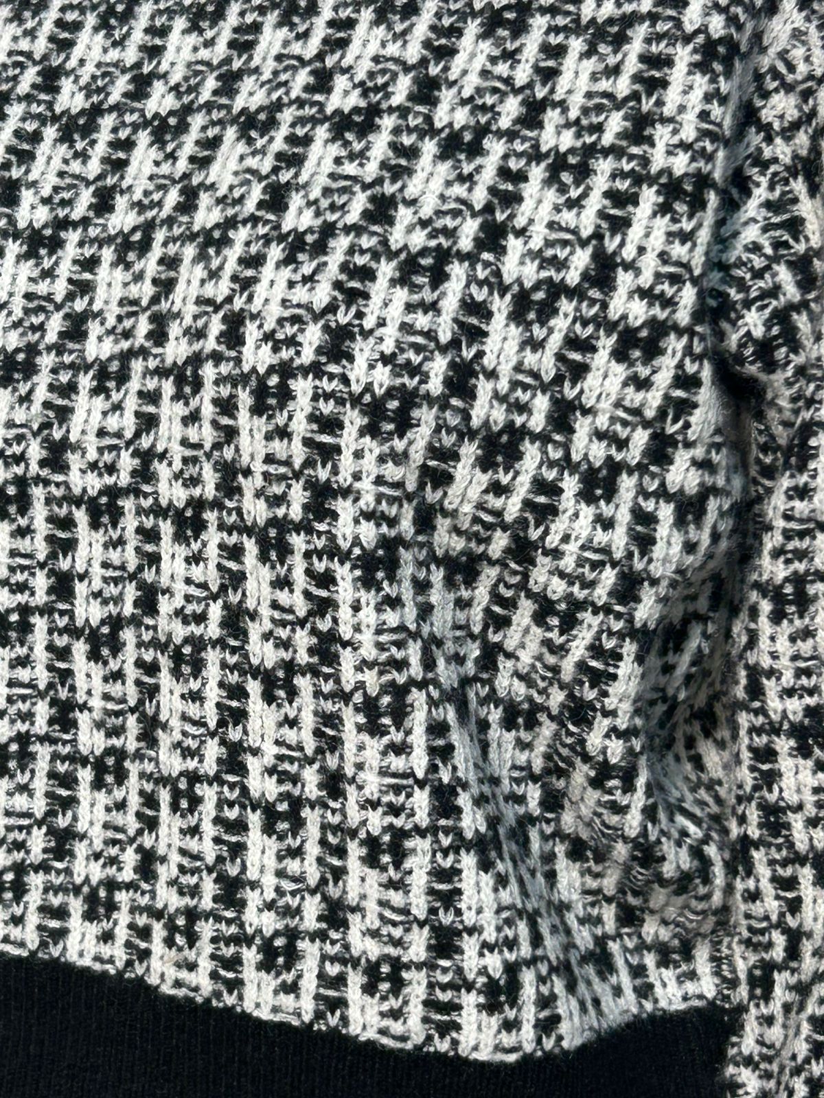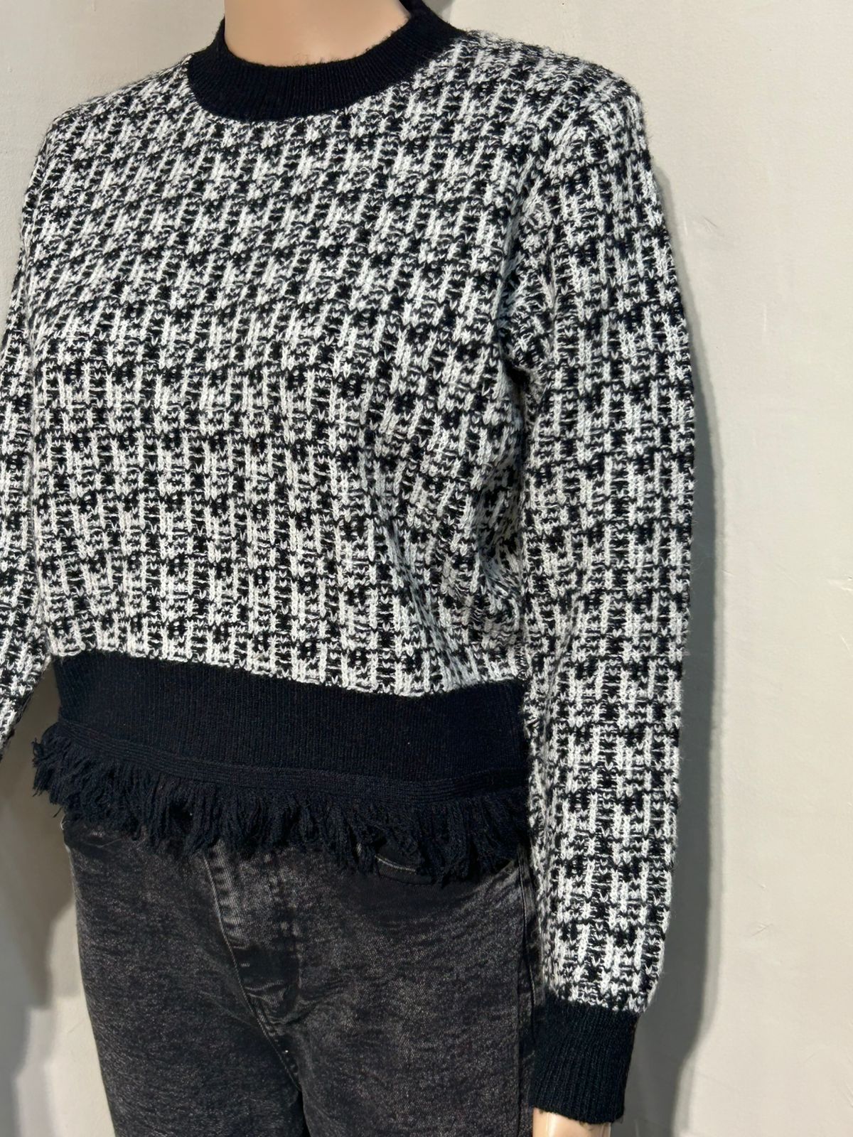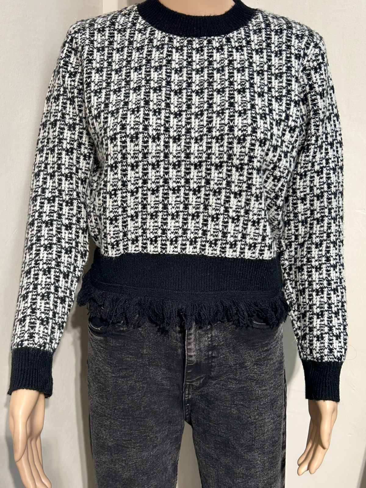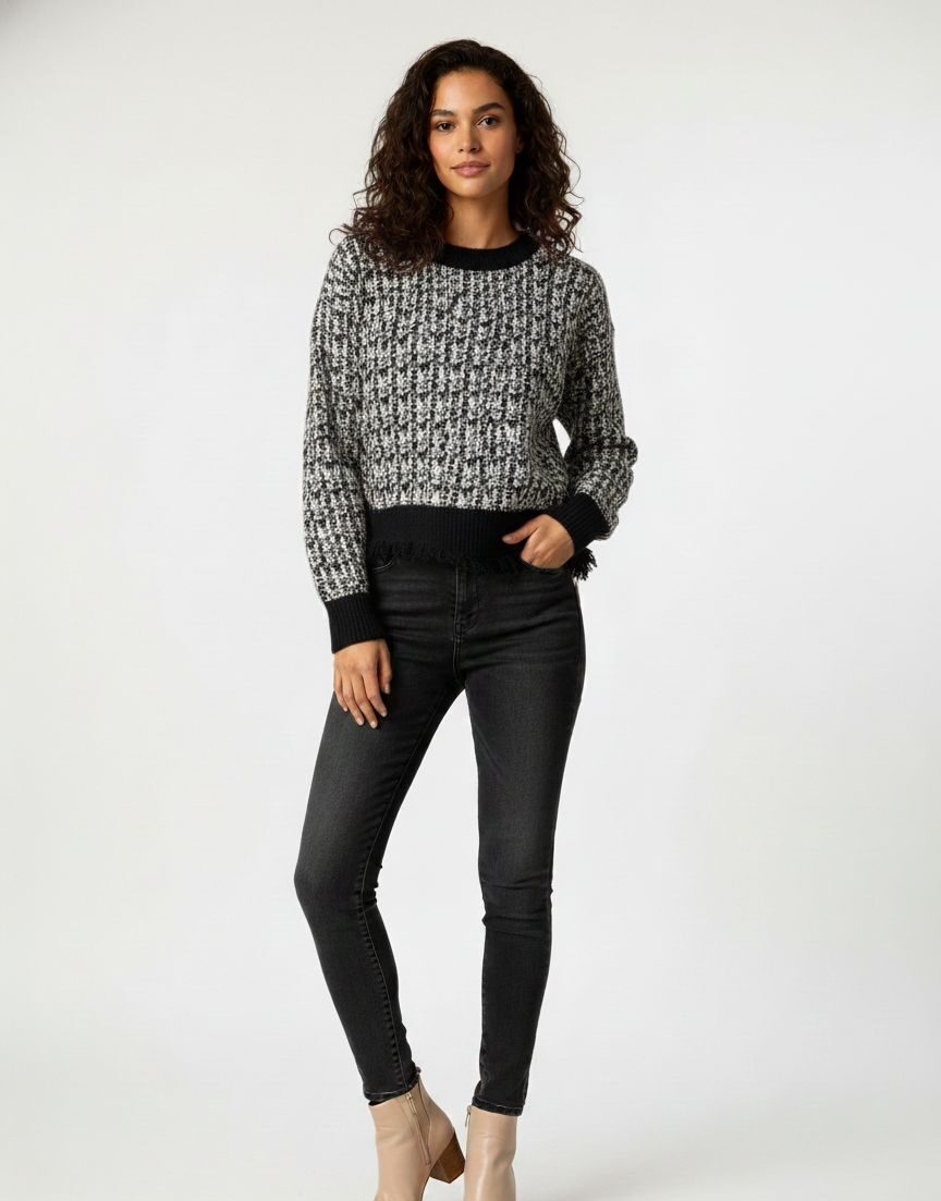 Elevate your cold-weather wardrobe with our sophisticated and cozy Tweed-Knit Pullover Sweater. This essential piece features a luxurious, dimensional boucle texture in a classic black and white weave, offering a rich depth that is easy to style. The traditional crew neckline is complemented by long sleeves and a modern, slightly cropped silhouette. A contemporary update comes in the form of the subtly frayed hemline and cuffs, adding an effortless, edgy finish to this timeless texture. It’s the perfect statement piece that transitions smoothly from office chic to weekend casual.