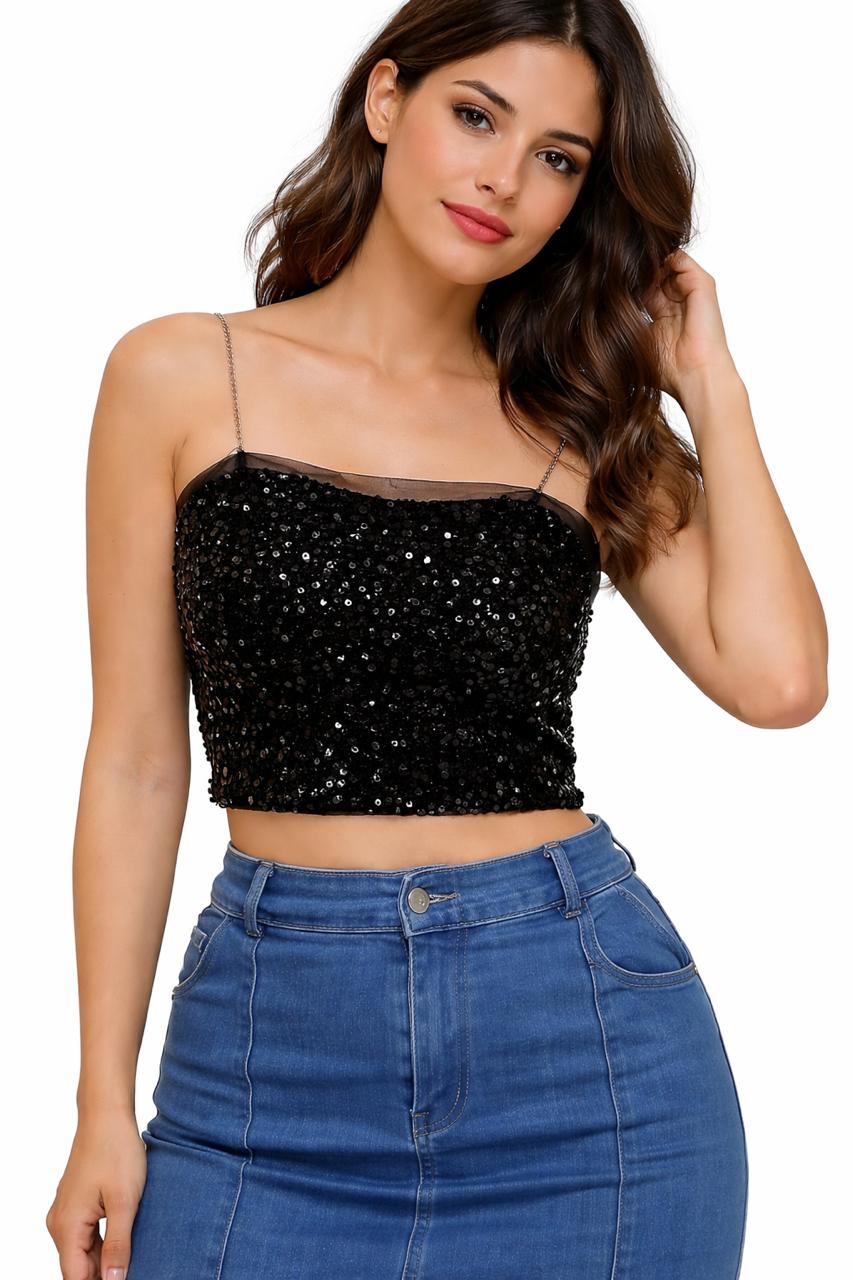 Black Sequin Crop Top with Chain Straps | Glam Party & Night Wear Top for Women