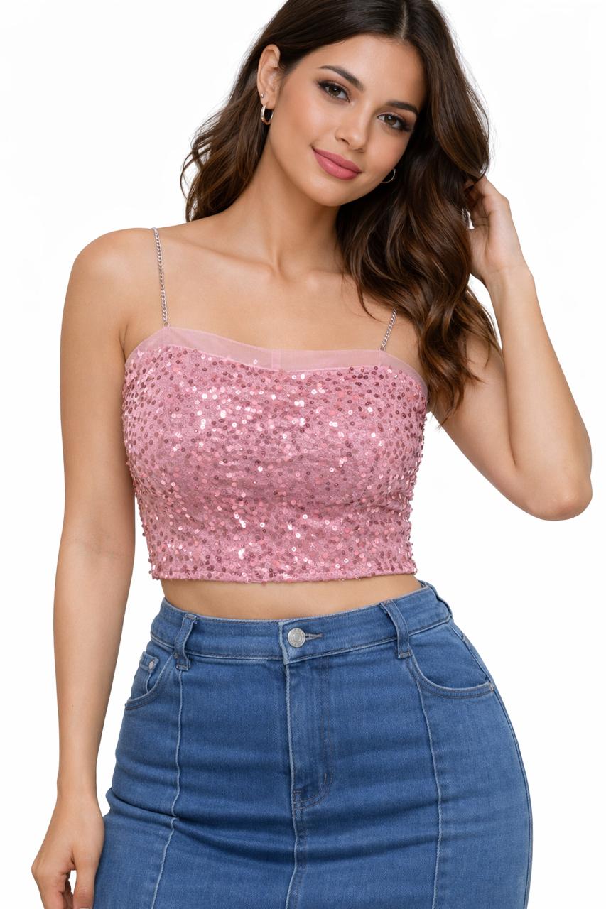 Blush Pink Sequin Crop Top with Chain Straps | Glam Party & Night Wear Top for Women