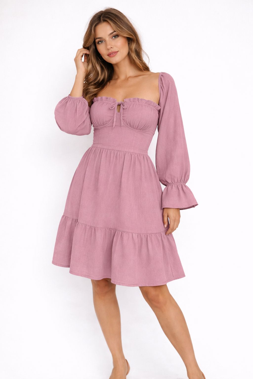 The long puff sleeves with elastic cuffs add a soft, romantic touch, while the fitted waist flows into a graceful tiered skirt for effortless movement. The midi length makes it perfect for brunch dates, garden parties, baby showers, vacations, or semi-formal occasions.