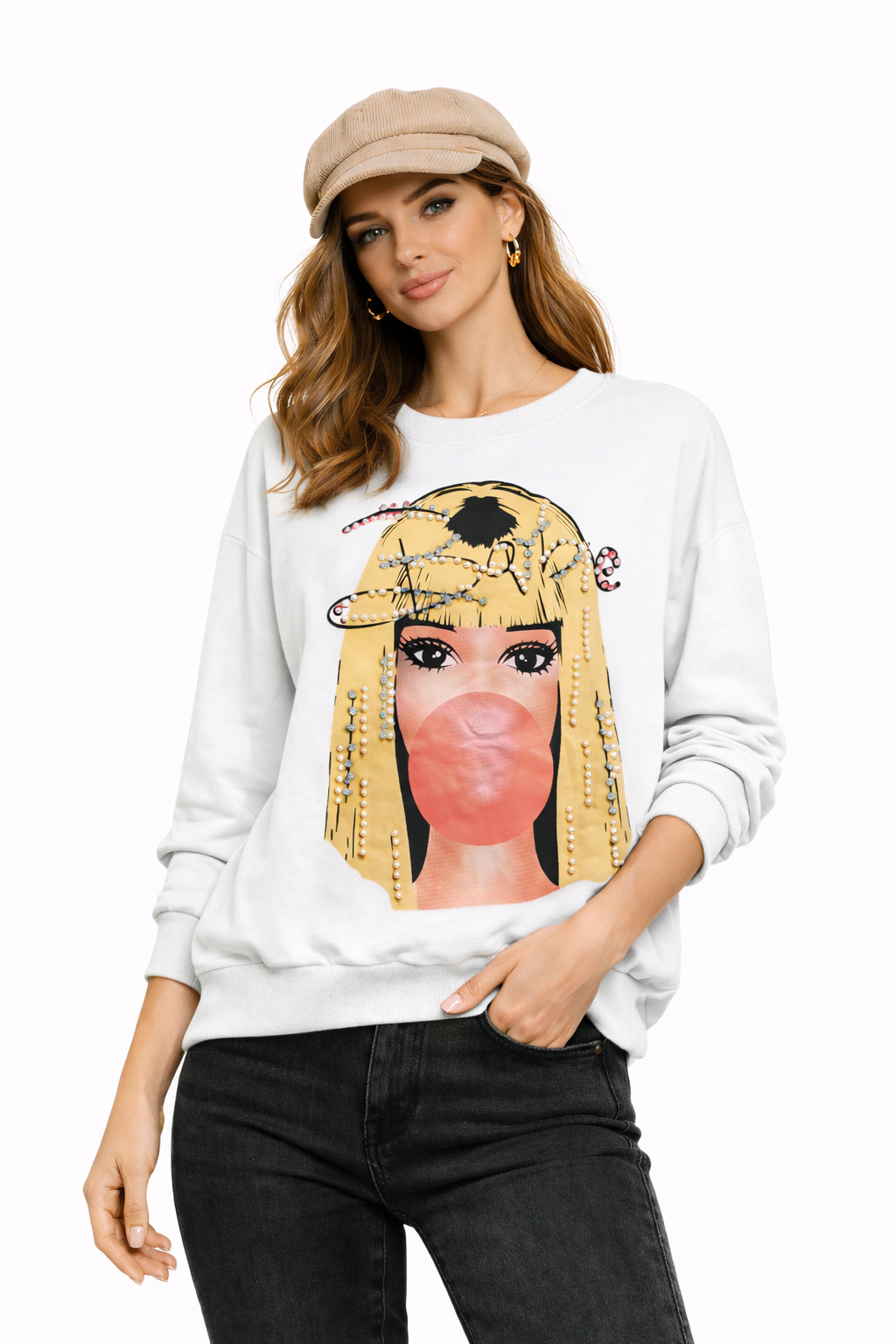 The striking fashion-girl graphic print with embellishment details adds a modern, edgy vibe, making it ideal for casual outings, travel, coffee dates, and winter layering. Crafted from soft, warm fabric, this sweatshirt keeps you comfortable while ensuring you stay on trend.