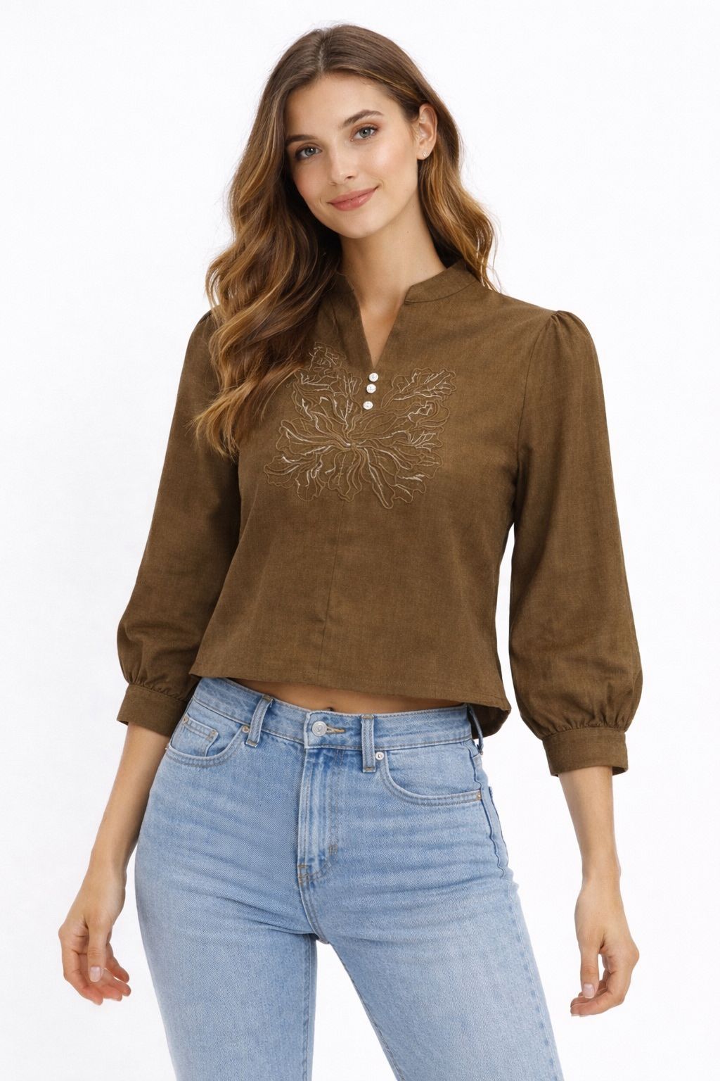 Women’s Brown Embroidered Top | Mandarin Neck 3/4 Sleeve Casual Wear