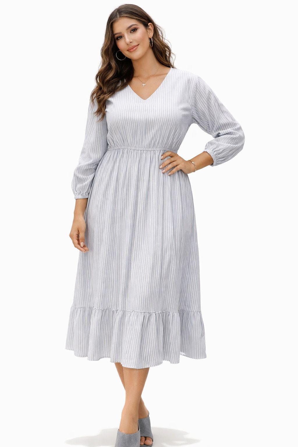 Upgrade your everyday style with this elegant pleated midi dress, designed for comfort and effortless charm. Featuring a flattering V-neckline, long sleeves, and a soft flared silhouette, this dress creates a graceful flow with every step.